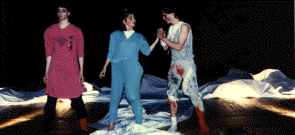 Les comédiens sortent peu à peu d'un immense drap couvrant le plateau. Leur costume est symbolique du mal qui les anime.